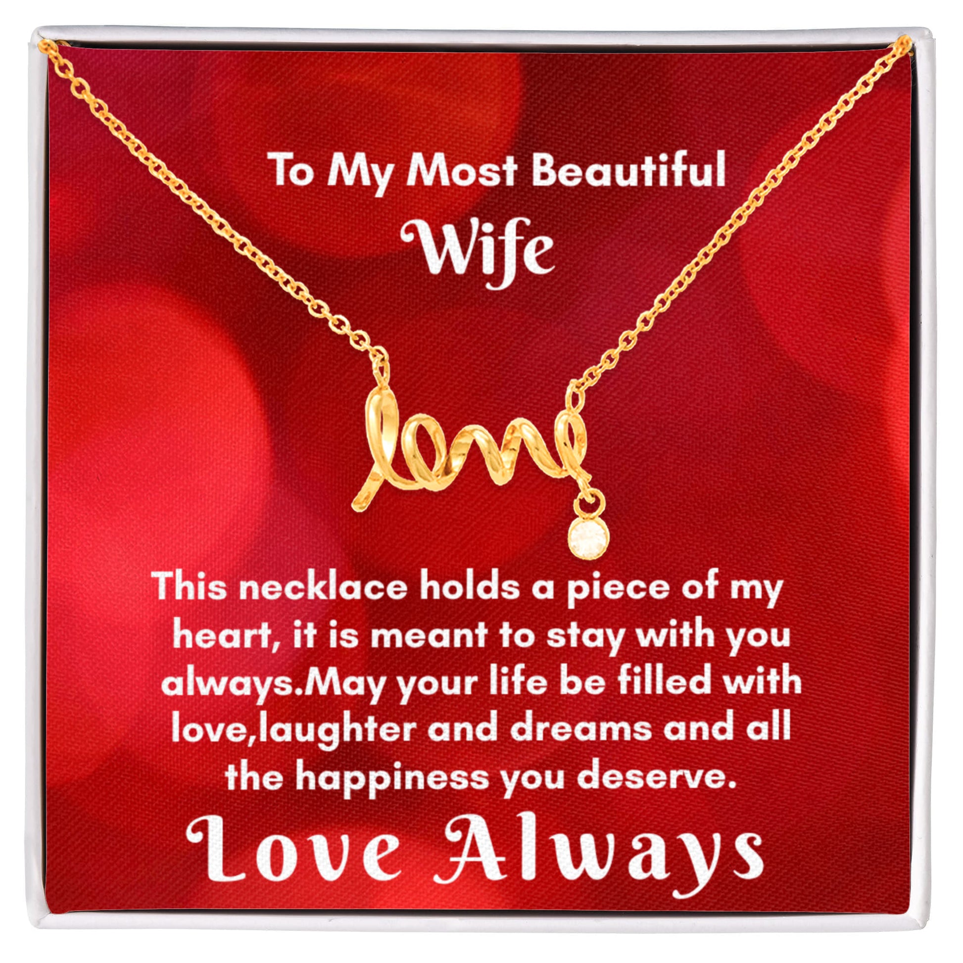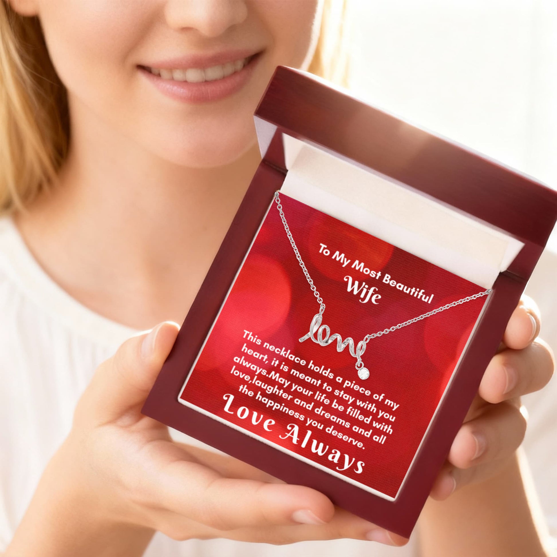 This dainty necklace leaves no doubt in her mind about your true feelings. Beautifully crafted, this adorable design spells out the word "love" in a playful cursive font. It is available in 2 different finishes, Polished Stainless Steel or 18K yellow gold finish. Upgrade to the luxury box and watch her face as she opens the box. A built-in LED light will make the necklace sparkle and shine.